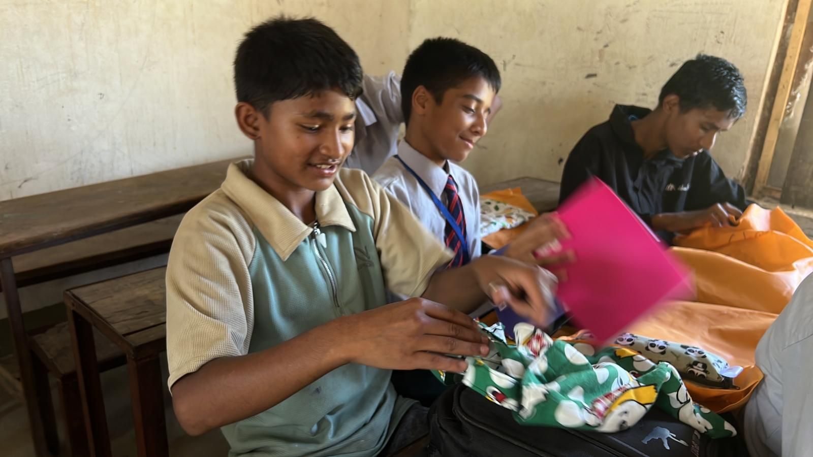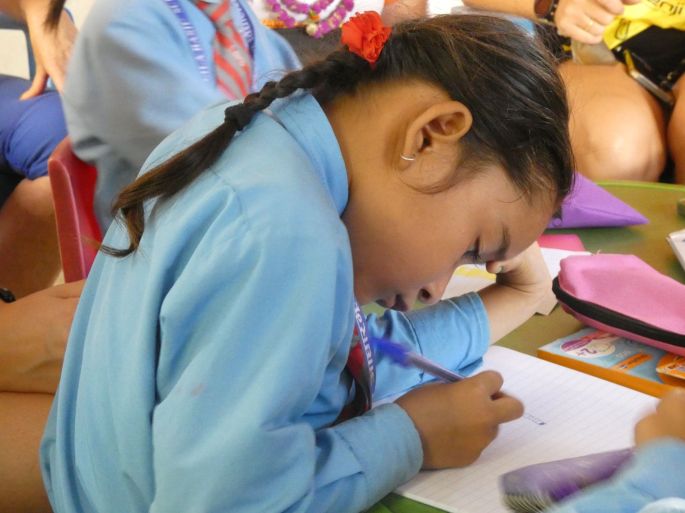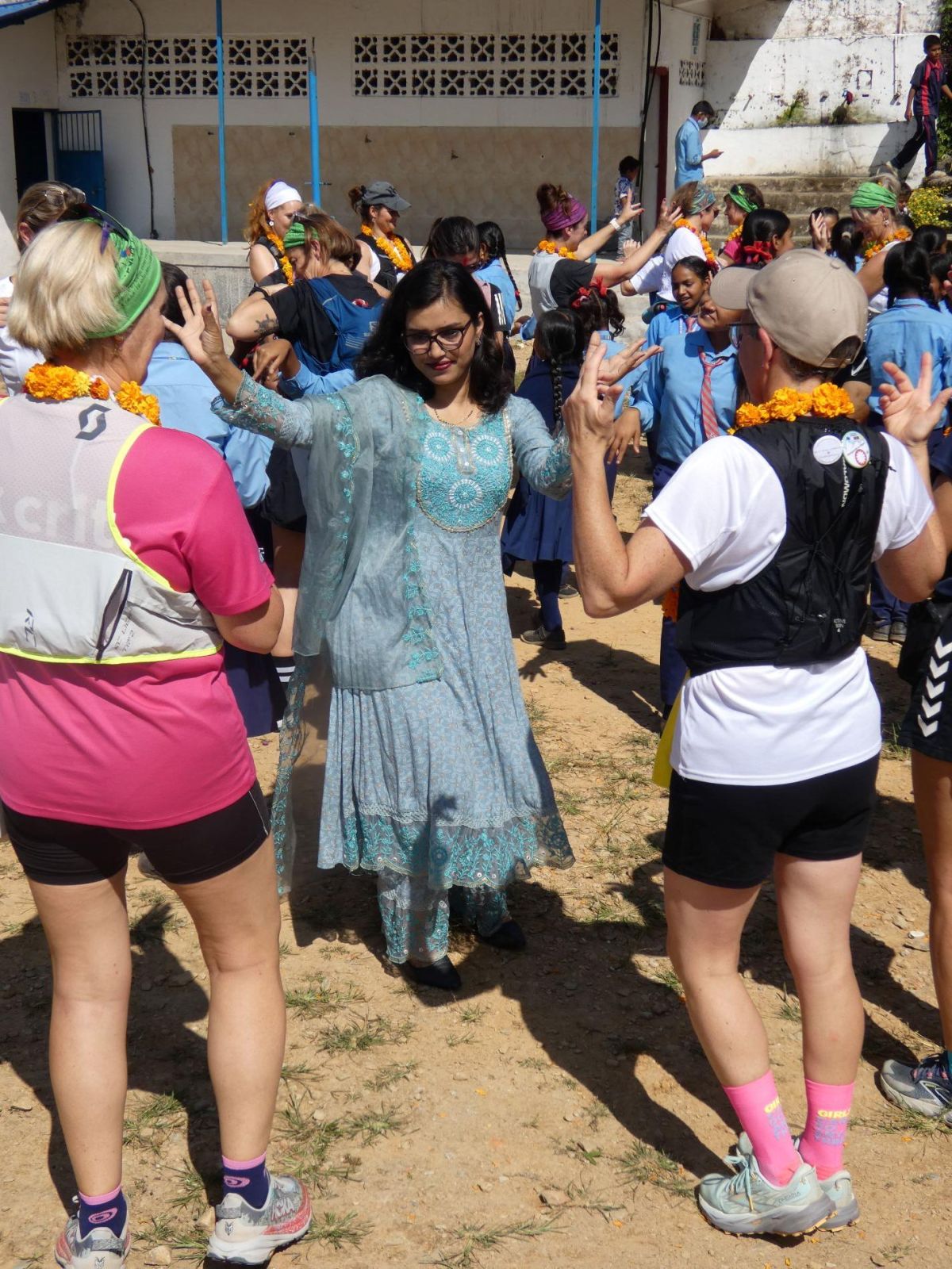 L'école où a eu lieu la distribution de matériel scolaire nous a accueillis de manière très simple mais tellement sincère. Une haie d'honneur d'une centaine d'enfants attendait les participantes à l'entrée de l'école avec les traditionnels colliers de fleurs. Des chants et des danses avec les enfants ont eu lieu dans la cour de récréation avant l'action de solidarité.