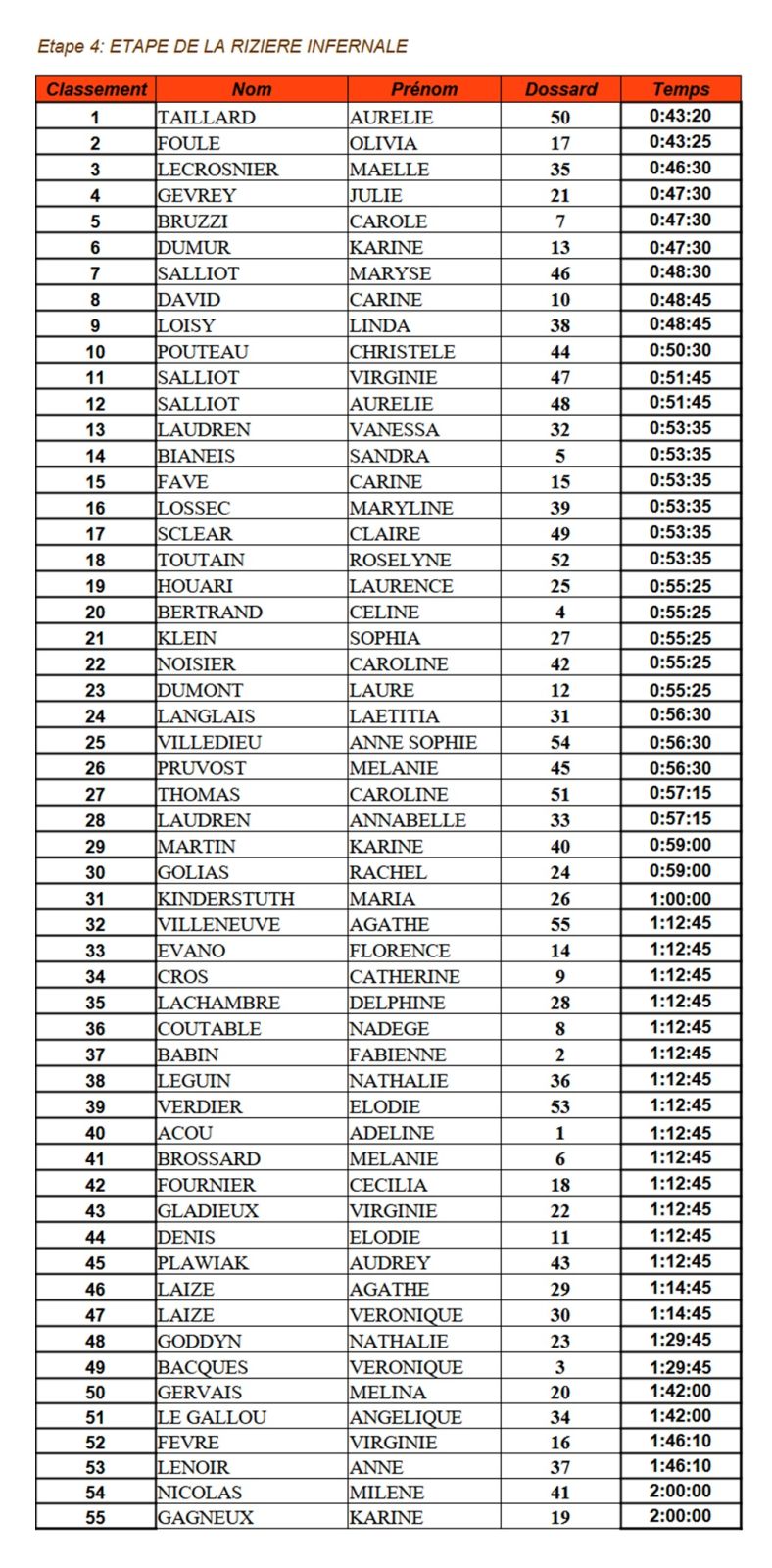 L'étape du jour est courte mais piégeuse car il y a une succession de rizières à longer et il est facile de se retrouver déséquilibré. Comme son nom l'indique, l'étape de la "Rizière infernale" a tenu toutes ses promesses. Quelques participantes ont eu du mal à trouver leur chemin à travers ces espaces humides où la récolte a débuté. La rivière qui serpente au fond de la vallée doit être traversée à deux reprises sachant qu'il y a très peu d'eau à ces endroits et qu'ils sont très sécurisés. C'est d'ailleurs après la deuxième traversée qu'était située la ligne d'arrivée et ce sont Aurélie TAILLARD et Olivia FOULE qui l'ont franchie espacées de cinq secondes. Trois minutes plus tard, c'est Maelle LECROSNIER qui a terminé puis un trio dans le même temps, Carole BRUZZI, Karine DUMUR et Julie GEVREY. La beauté de cette étape a fait l'unanimité malgré une distance courte de 5 kilomètres.