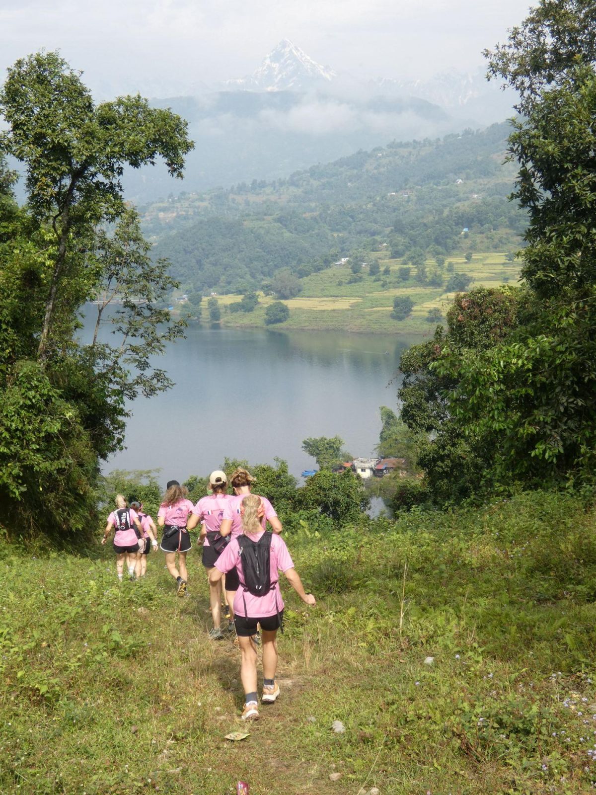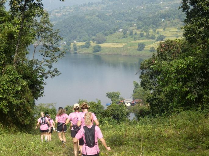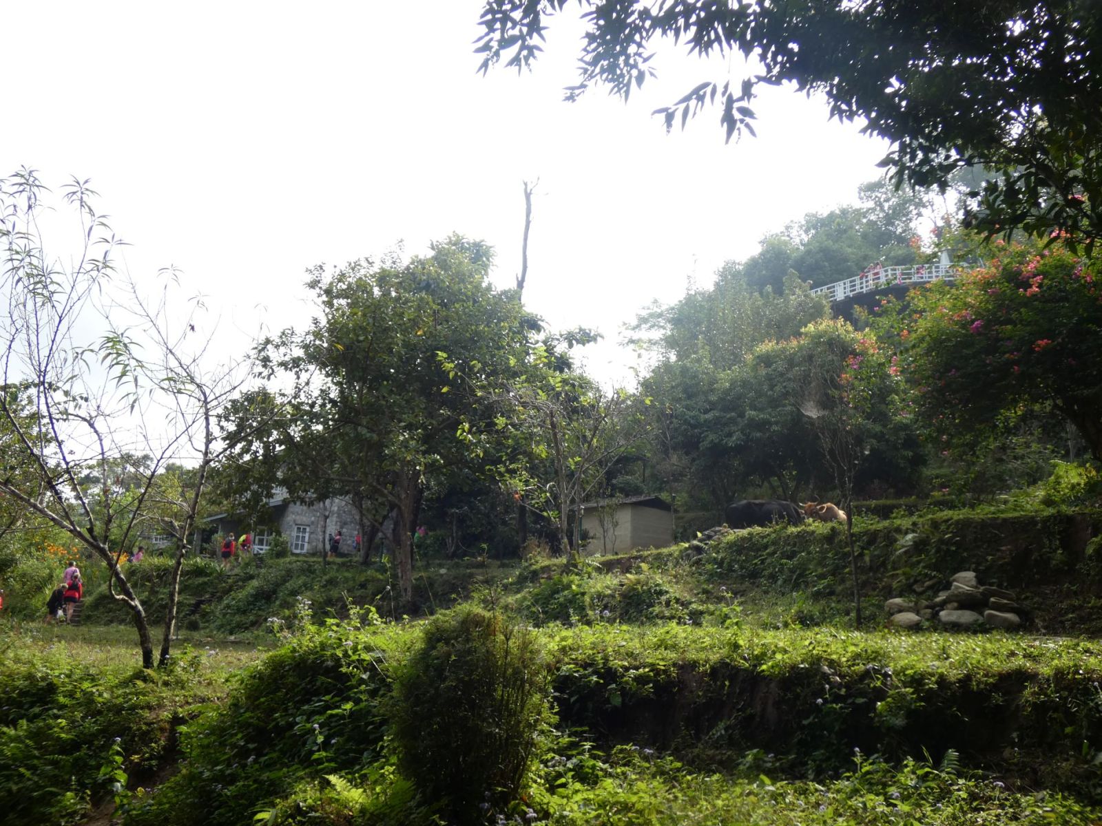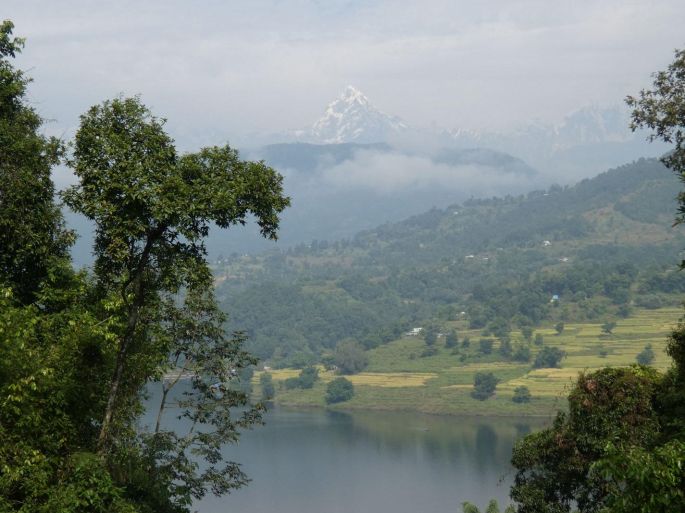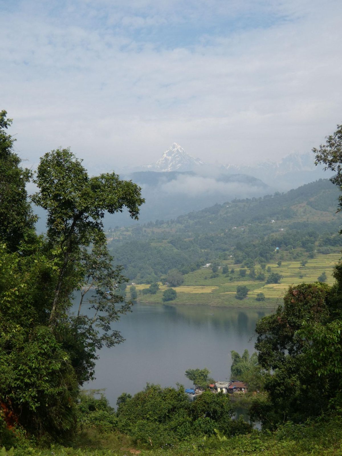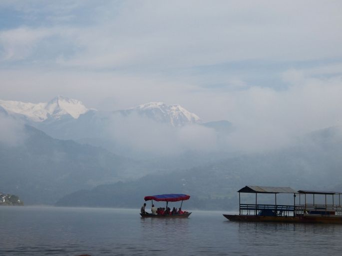 Départ de Pokhara à destination de Begnas, par bus. D'ici quelques années, ce trajet sera certainement plus agréable. A ce jour, des travaux d'aménagement, entamés depuis longtemps, créent des bouchons et rendent la circulation chaotique vers les berges du lac de Begnas, de plus en plus fréquentées. La surprise du jour est magique : c'est en barque que le groupe va rejoindre l'hôtel @The Begnas Lake Resort and Villas. Une brume est installée à la surface de l'eau tout en laissant apparaître les sommets des Annapurnas dont la majestueuse montagne sacrée, le Machapuchare.