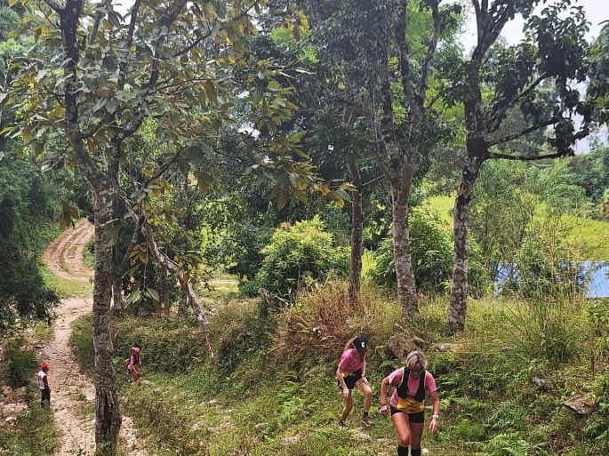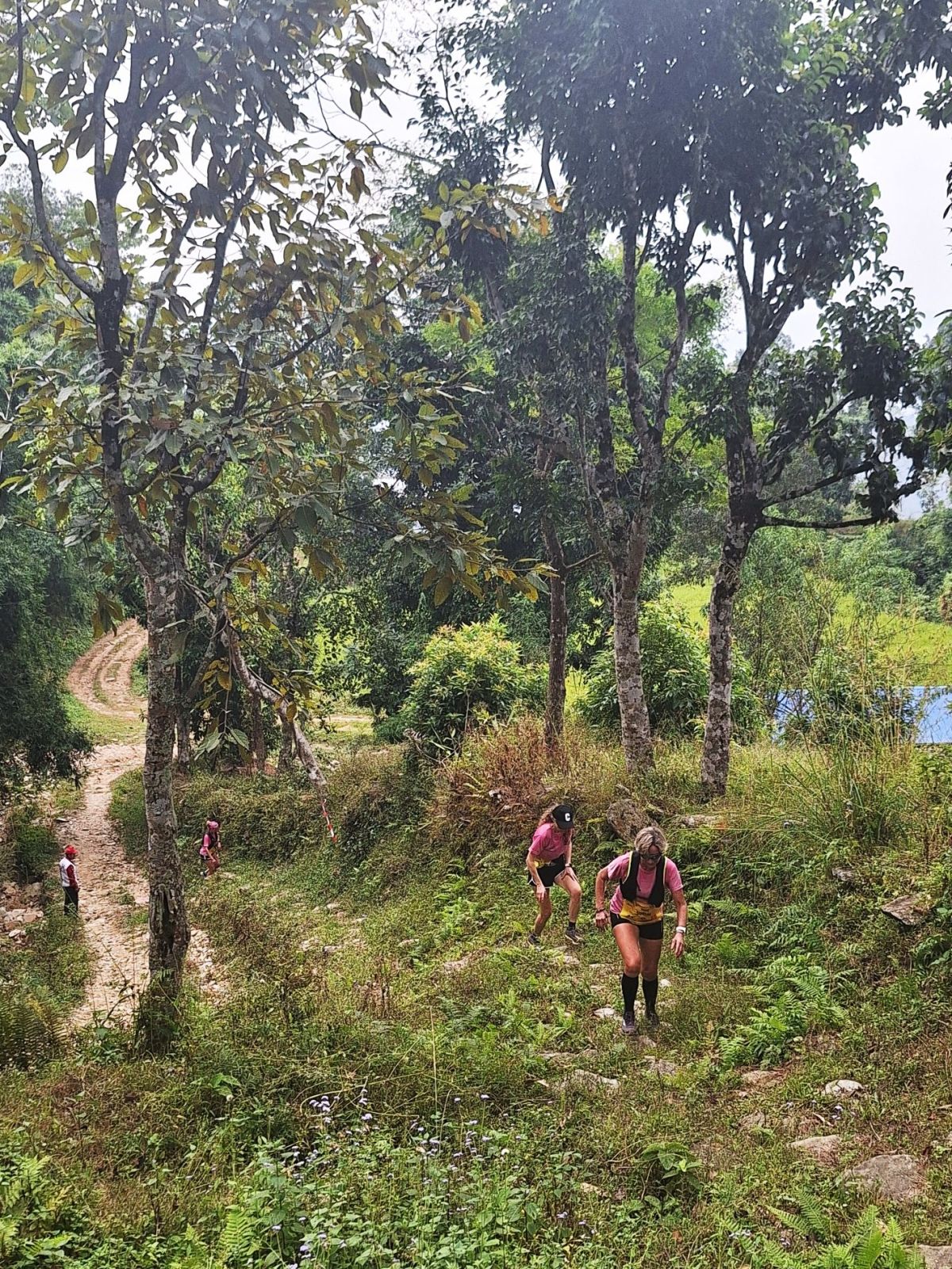 A peine le temps de traverser les installations à flanc de colline, les concurrentes doivent gravir les 256 marches qui mènent à la ligne de départ. Particularité de la course du jour : un contre la montre. Par petits groupes, en sens inverse du classement général, partent toutes les 3'. Les dernières partent les premières et seront doublées, ce qui permet de s'encourager le long du parcours. Le décor est varié, de la descente, des rizières et... une montée... encore une... éprouvante.