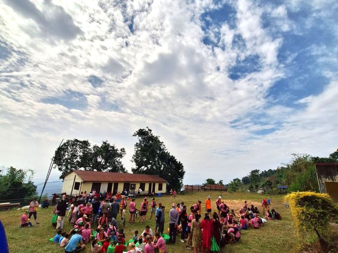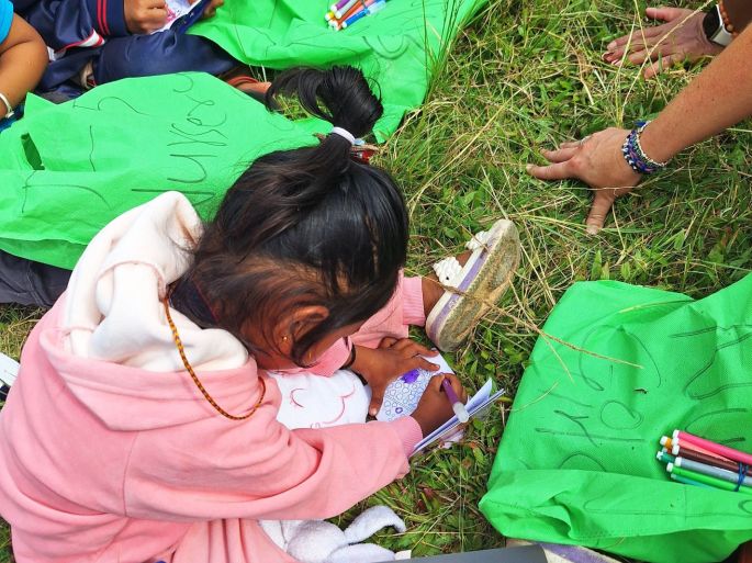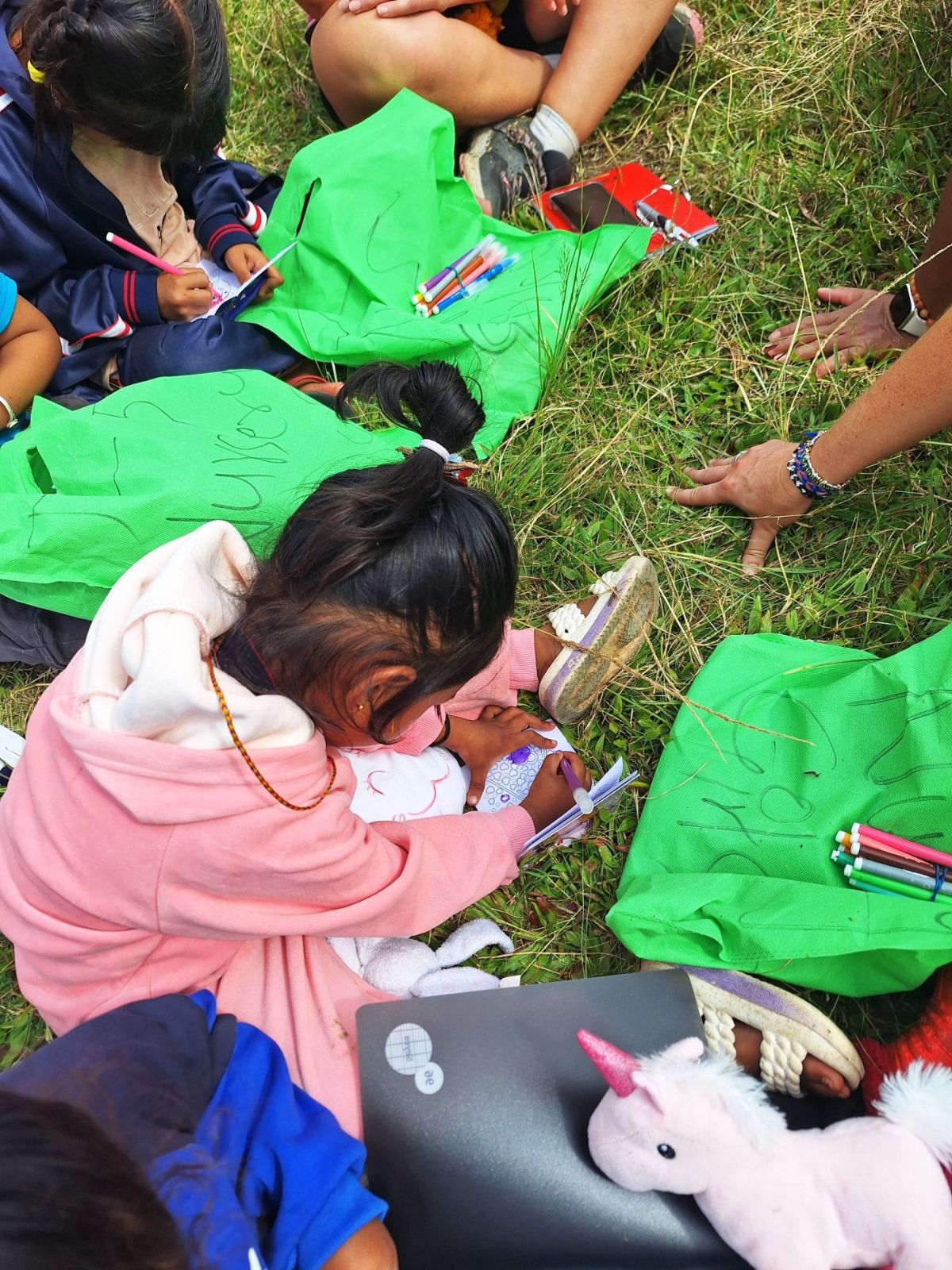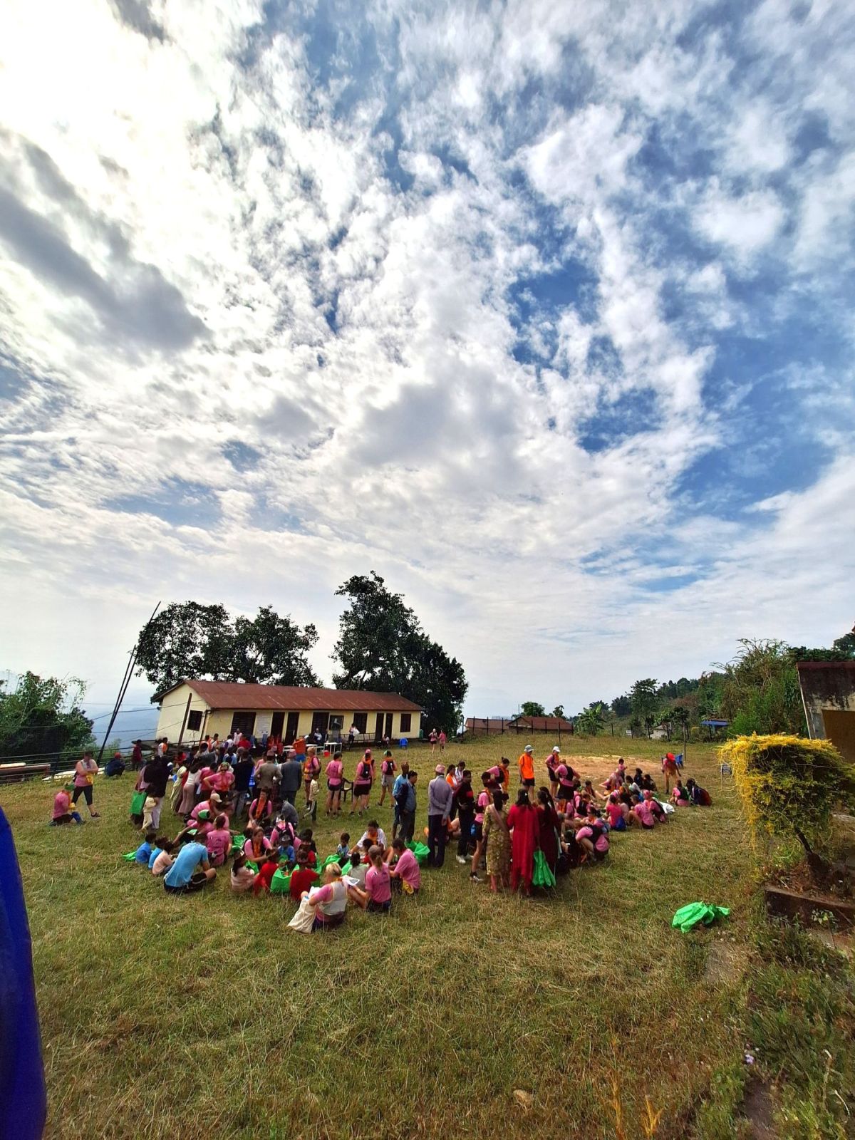 L'école ne reprend que ce 28 octobre et pourtant, le directeur, les enseignants sont présents et ont su motiver des élèves. La distribution a lieu sur l'herbe après un temps de rencontre entre jeux et danses.