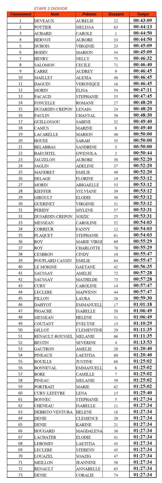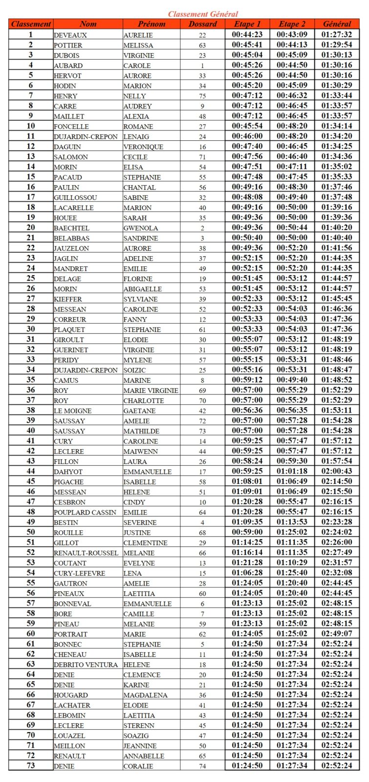 Comme hier, Aurélie DEVEAUX arrive en tête de l'étape, suivie cette fois de Melissa POTTIER. A la troisième place, nous retrouvons Carole AUBARD et Aurore HERVOT qui semblent faire la course ensemble puisqu'elles occupaient la quatrième place sur la première étape.