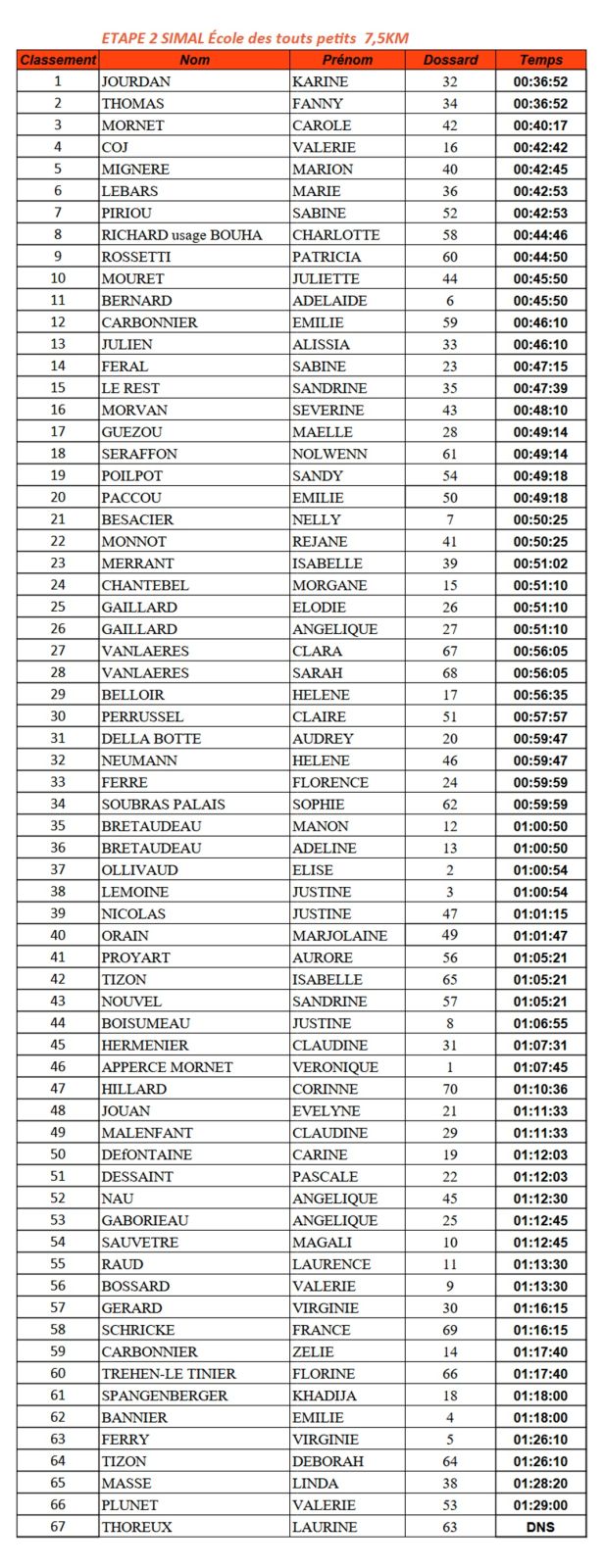Et de 2 ! Côté course, il semble que Karine JOURDAN et Fanny THOMAS aient opté pour faire la course ensemble puisque, sur cette deuxième étape, elles arrivent ensemble, comme hier. Puis, vient Carole MORNET, à la même place qu'hier, suivie de Valérie COJ puis Marion MIGNERE.