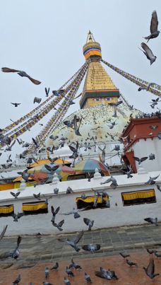 Les concurrentes du groupe SOLEIL profite d'une dernière journée dans la Capitale, qui, malgré la pluie, va permettre de découvrir le site de Bodnath. Au détour de ce boulevard grouillant d'activité, un porche nous invite à entrer vers un des principaux sanctuaires religieux du Népal. Et là, la surprise est de taille... en levant les yeux vers cet immense stupa orné de drapeaux à prières.