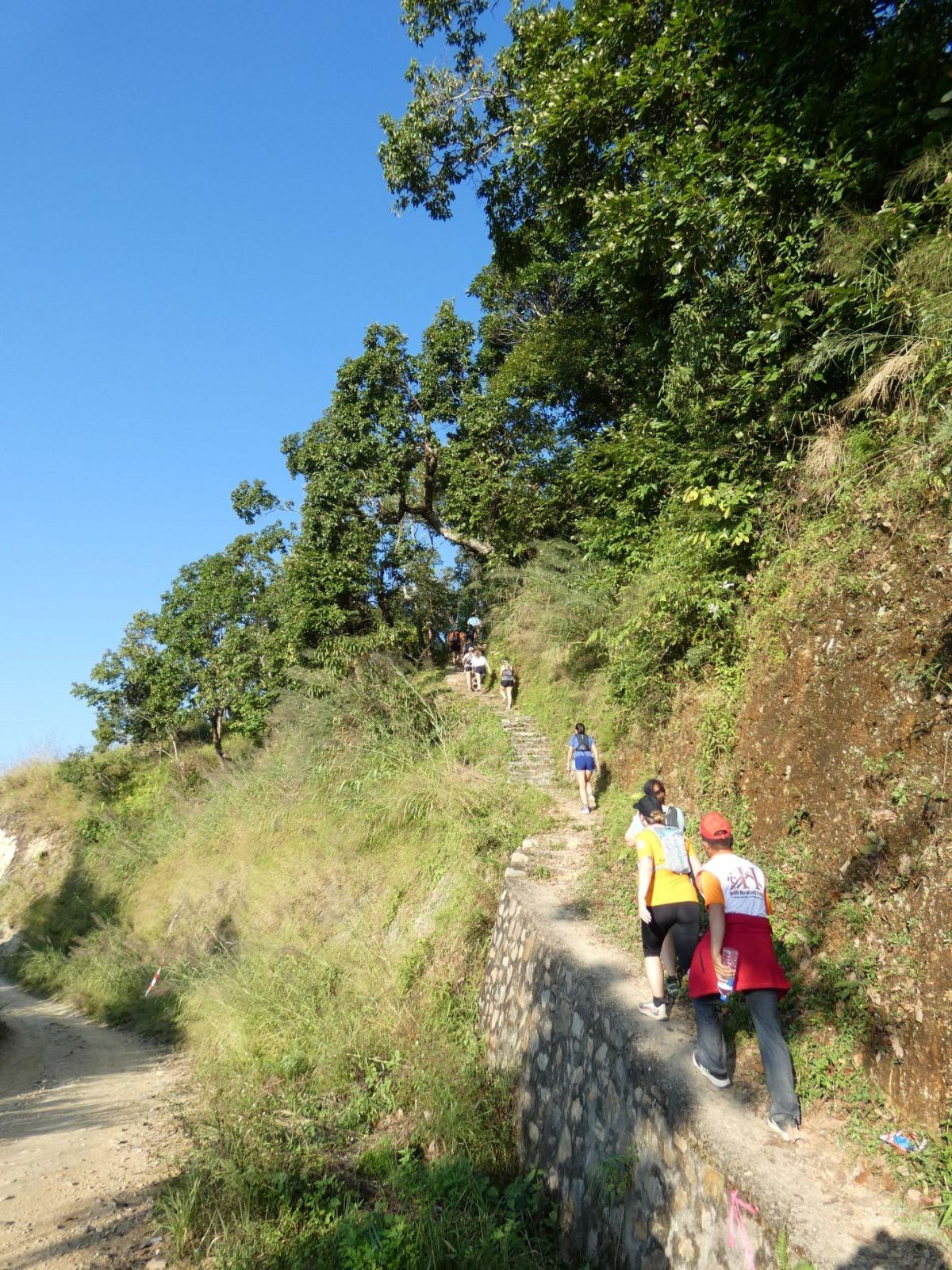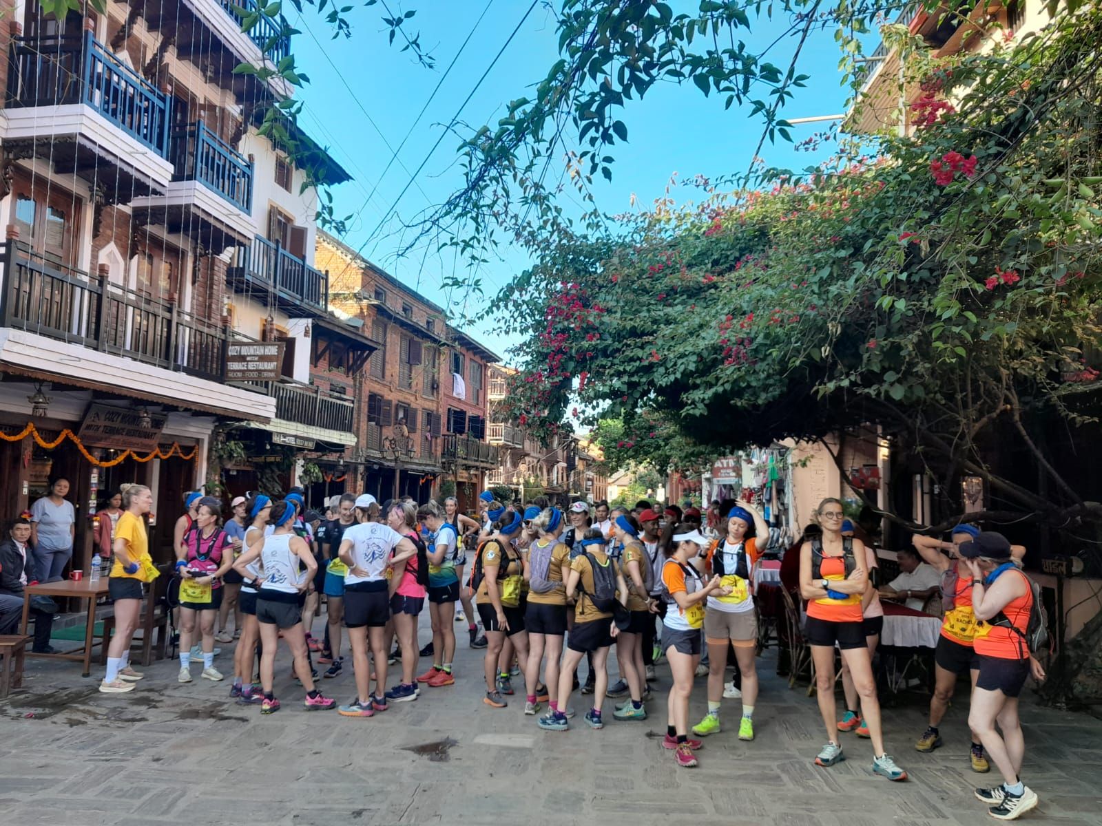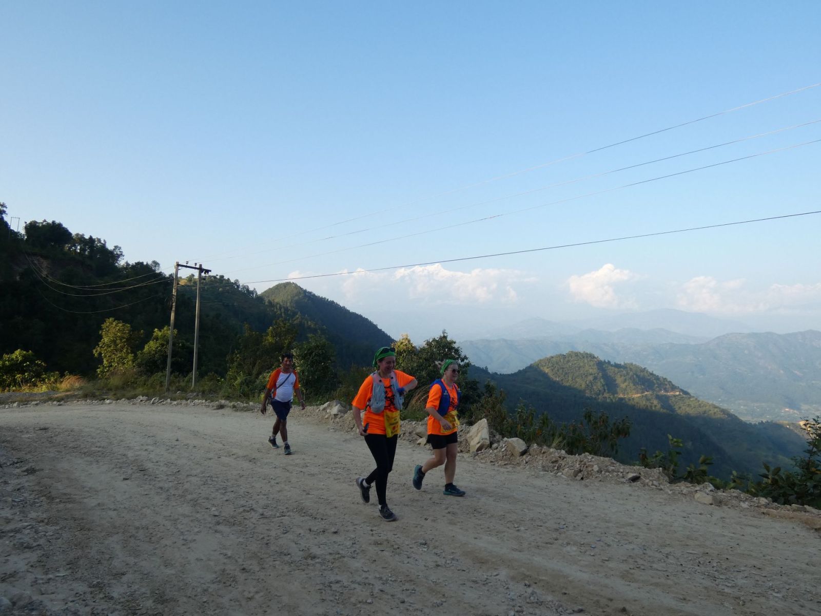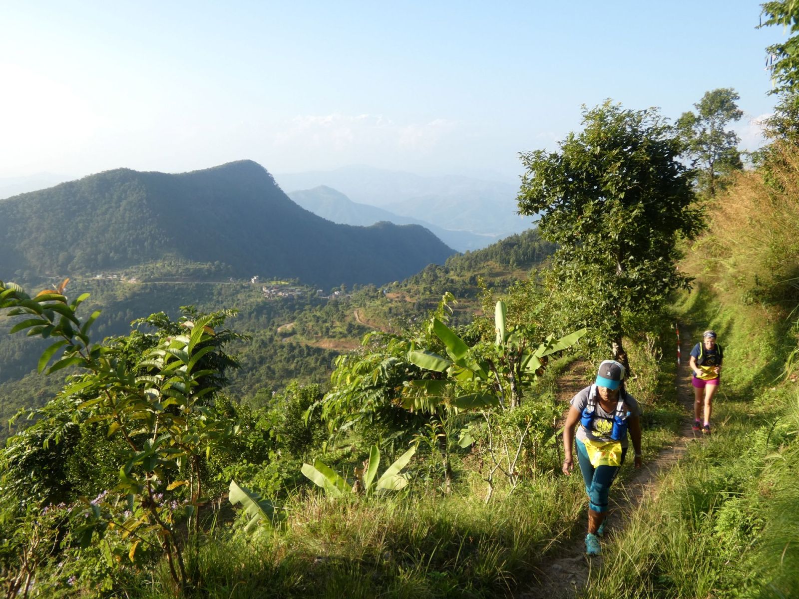 Juste le temps de déjeuner, poser la valise et c'est l'heure du rendez-vous sur la ligne de départ, à 15 h. Le parcours amène les concurrentes vers la sortie du village pour descendre vers la piste qu'elles suivront jusqu'à atteindre un sentier qui ne fera plus que monter.... Et enfin, du plat, et quelle récompense !! La vue est magnifique là-haut et nous pouvons admirer les hauts sommets de la chaîne himalayenne.