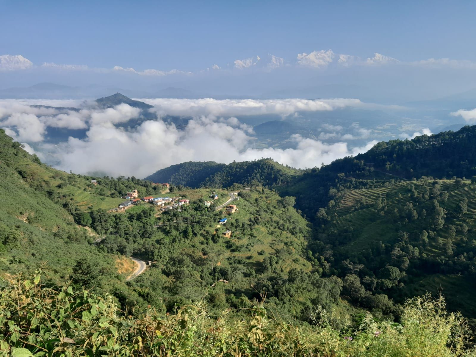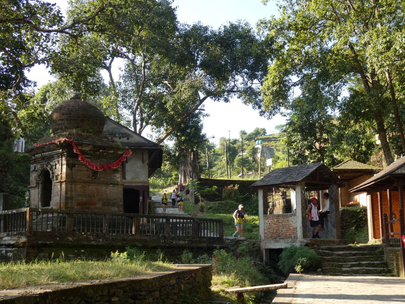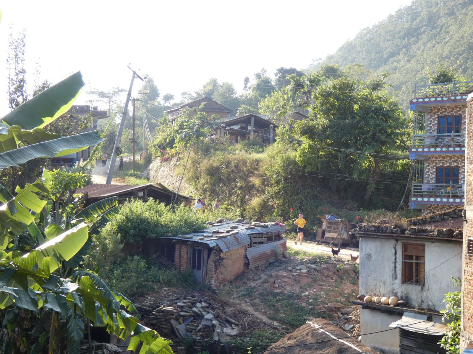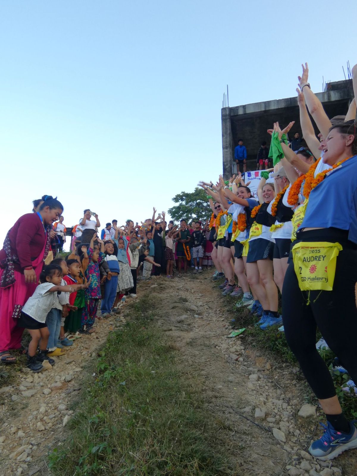 Juste le temps de déjeuner, poser la valise et c'est l'heure du rendez-vous sur la ligne de départ, à 15 h. Le parcours amène les concurrentes vers la sortie du village pour descendre vers la piste qu'elles suivront jusqu'à atteindre un sentier qui ne fera plus que monter.... Et enfin, du plat, et quelle récompense !! La vue est magnifique là-haut et nous pouvons admirer les hauts sommets de la chaîne himalayenne.