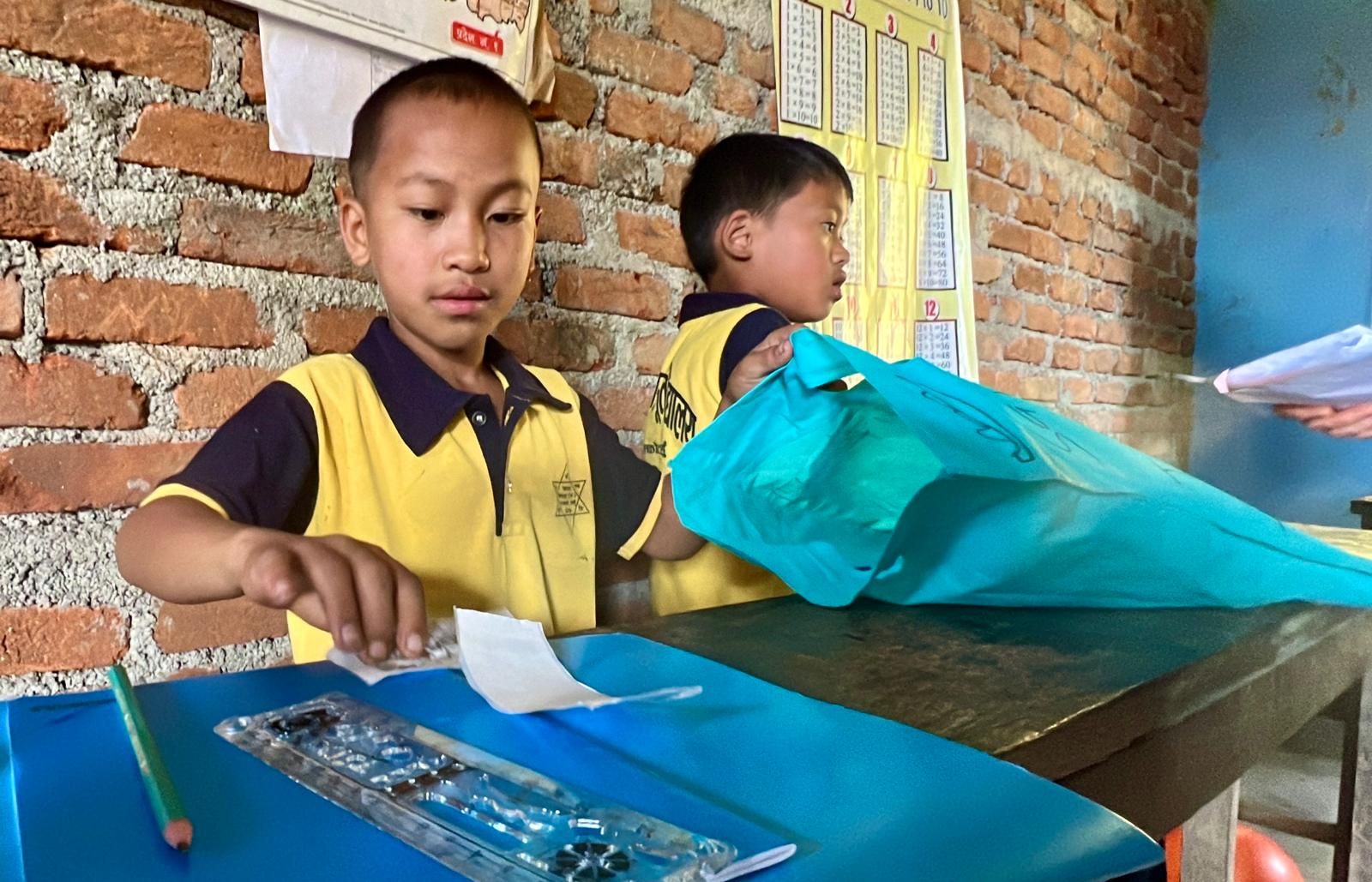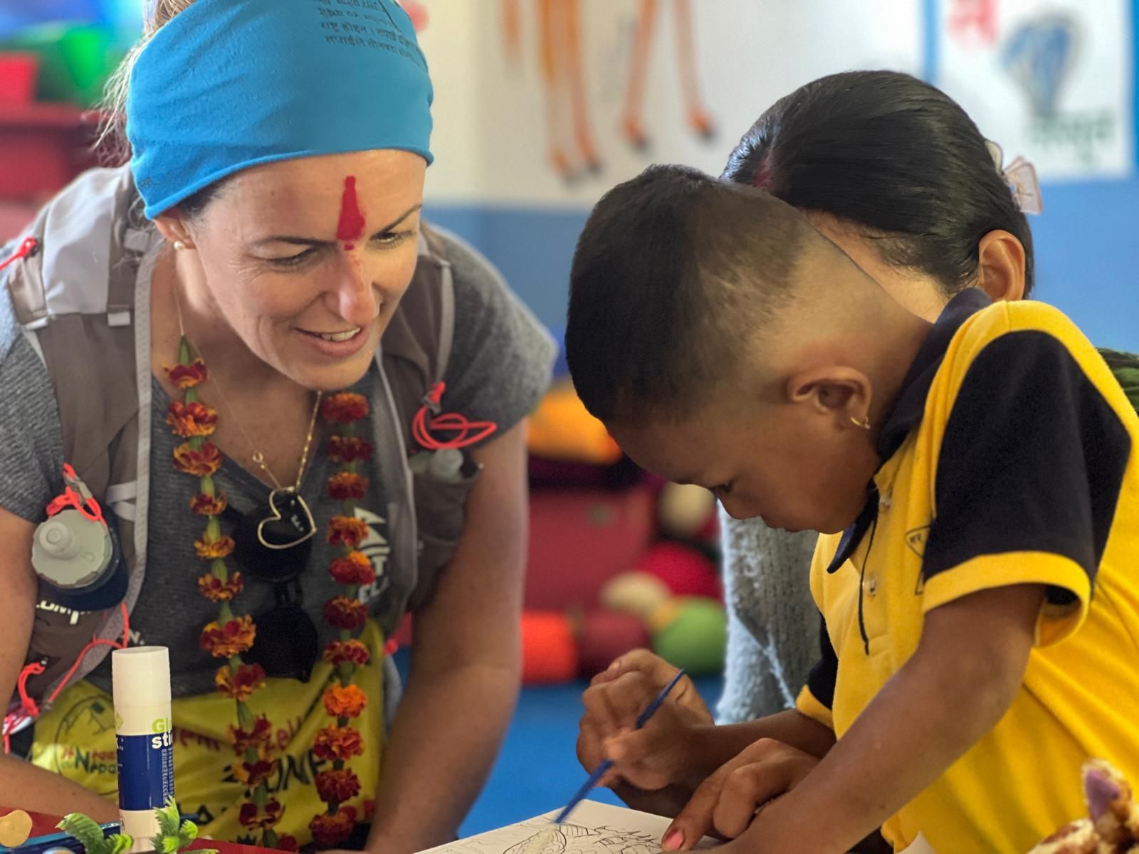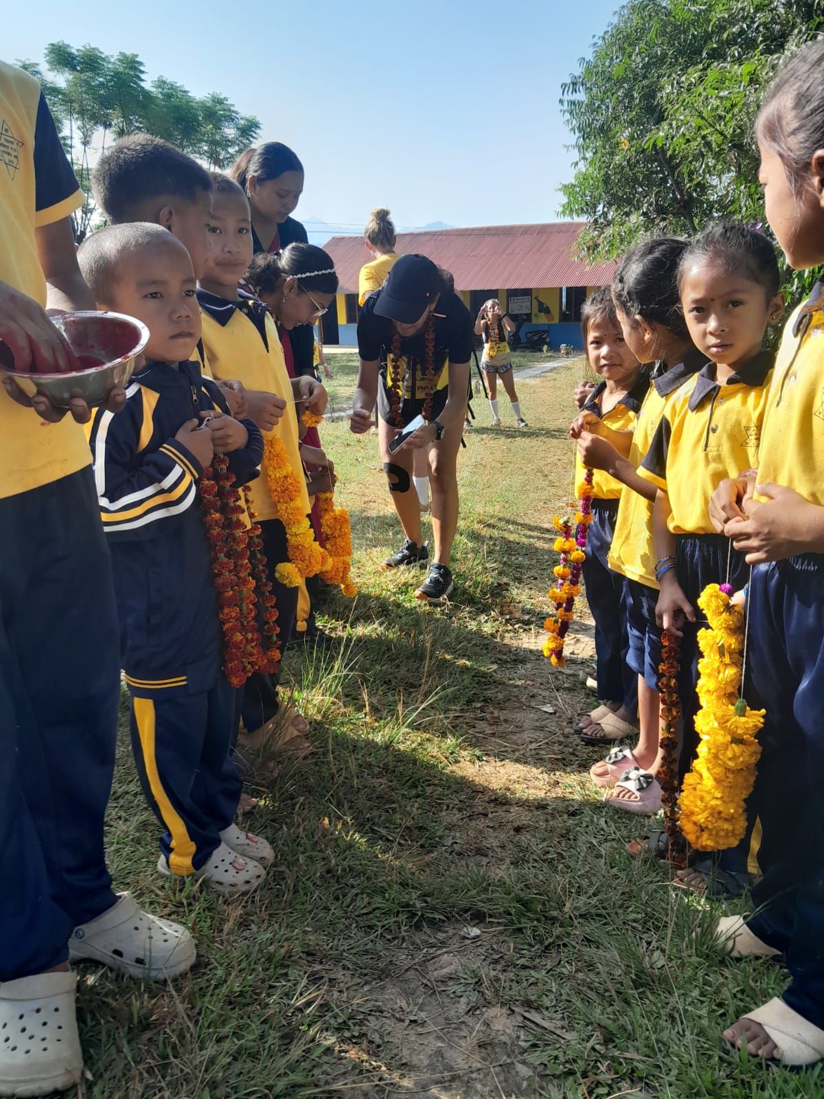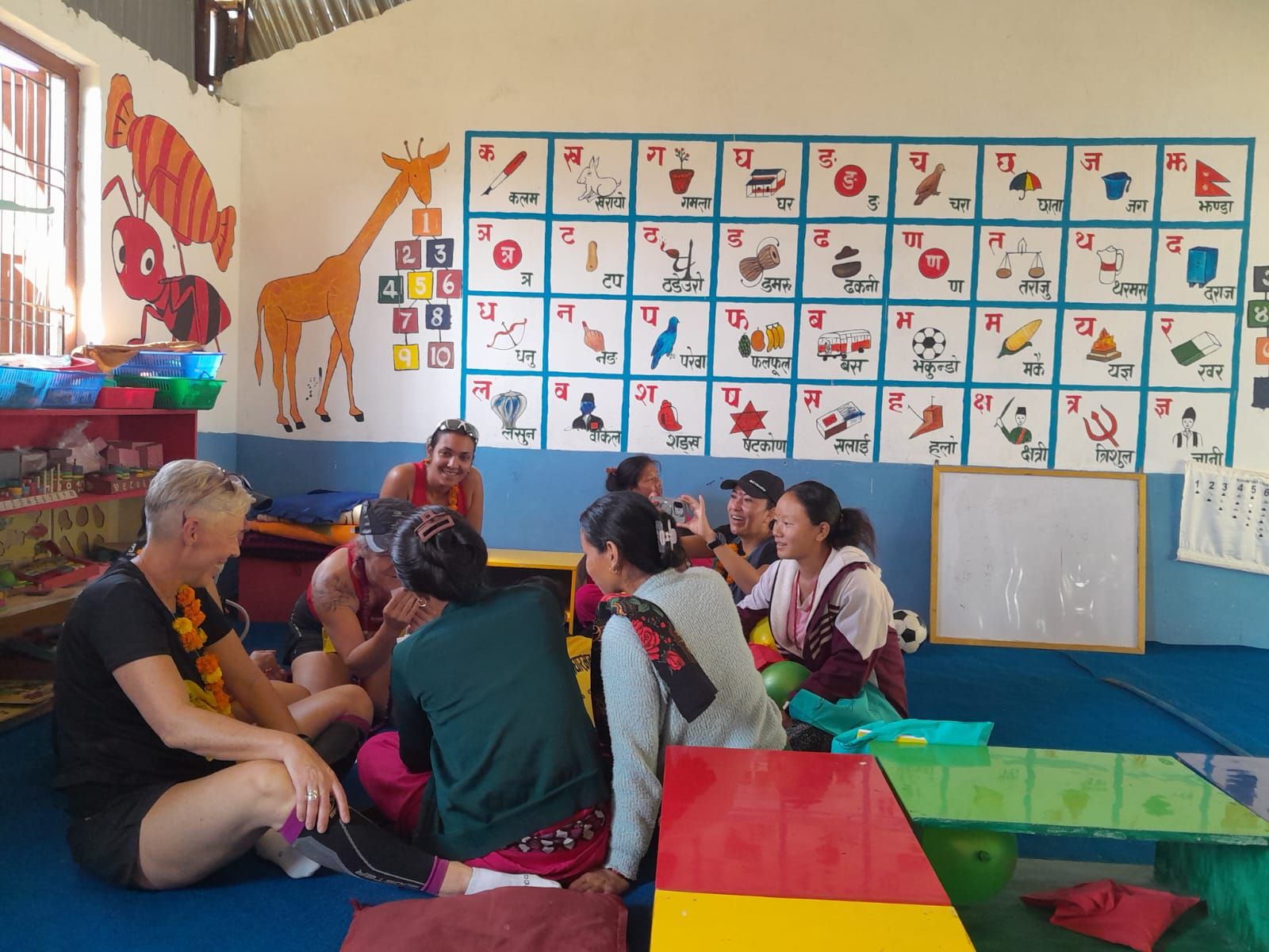 Anecdote amusante : l'école est fermée et seulement quelques élèves sont présents. Pourtant des enfants crient, s'excitent à l'arrivée de chacune des participantes. En fait, la fameuse fête de Tihar consacre une journée à la célébration d'un être différent par jour. Hier, c'était la fête des frères et des soeurs ce qui implique des mouvements de population de la ville à la campagne, et réciproquement, d'une région à l'autre. Aujourd'hui, nous avons pu offrir les quelques jeux, jouets disponibles à ces enfants venus en famille.