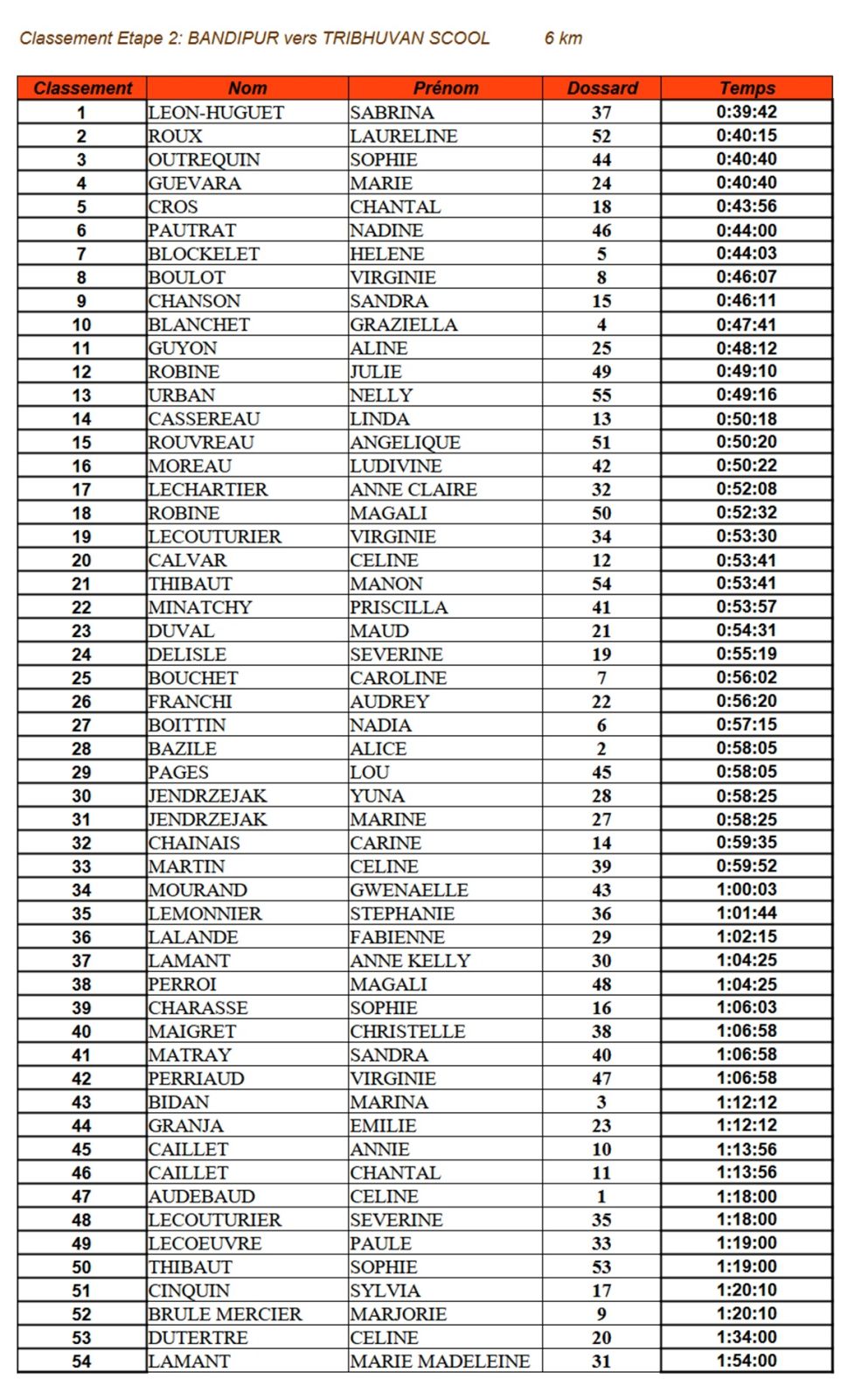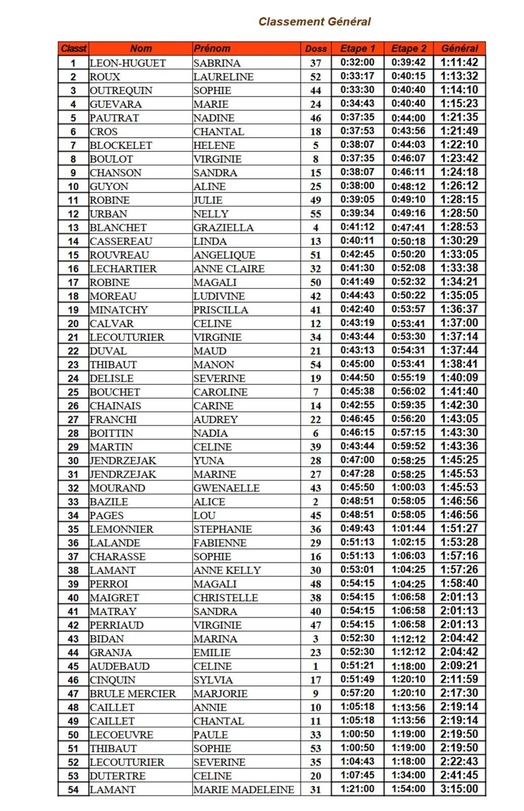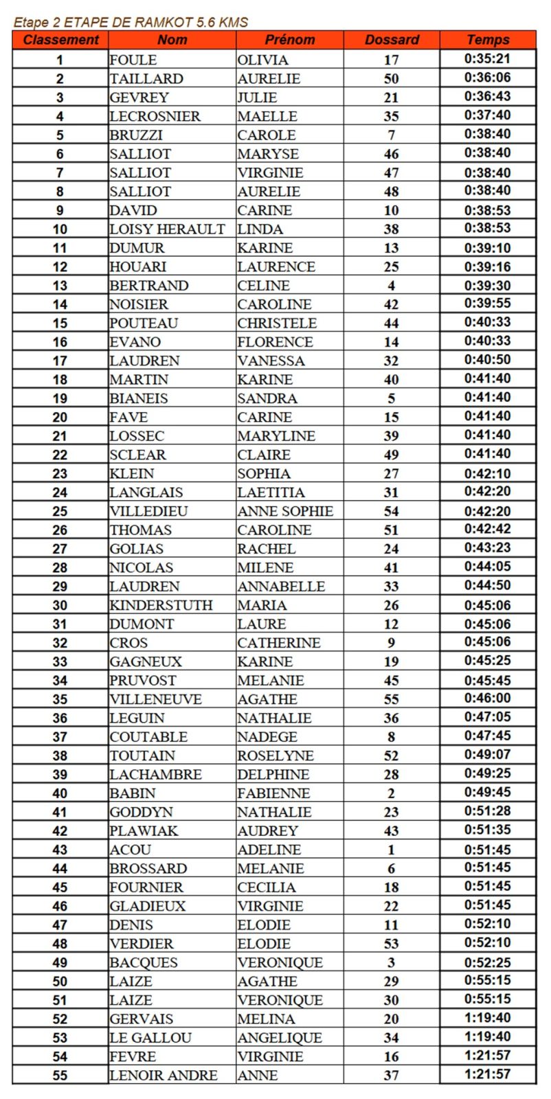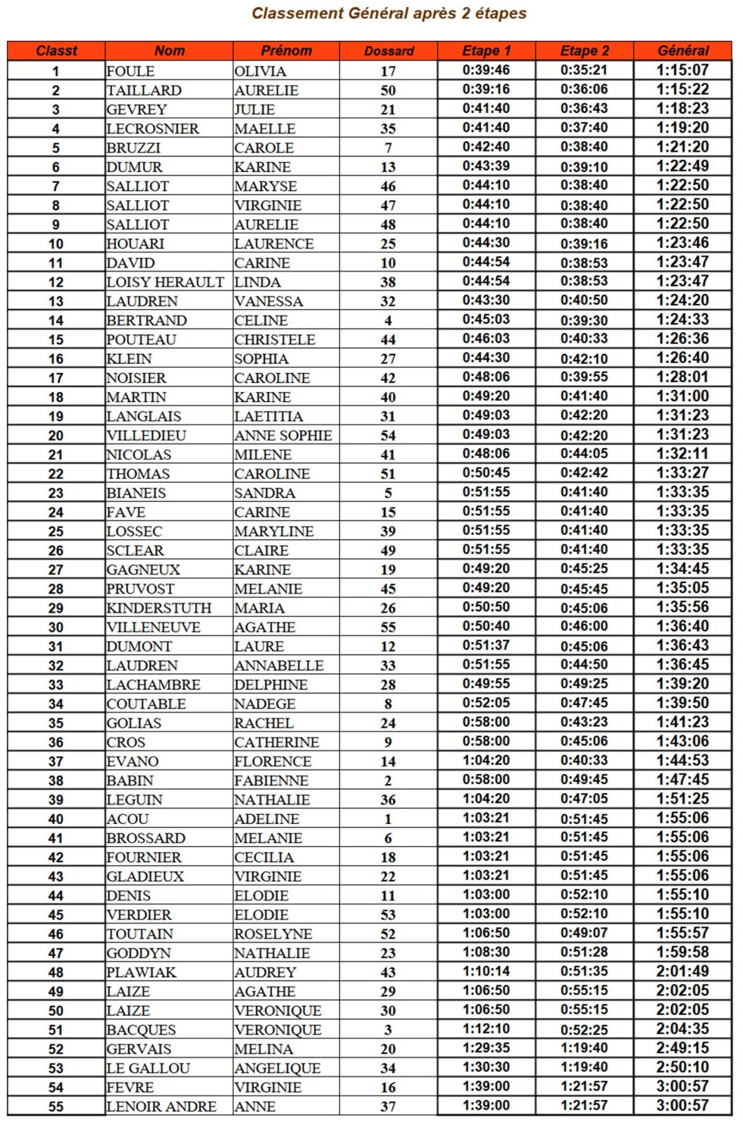 Côté course, c'est Aurélie FOULE qui franchit la première la ligne d'arrivée suivie d'Aurélie TAILLARD et de Julie GEVREY. Le classement général est le même que le classement du jour.